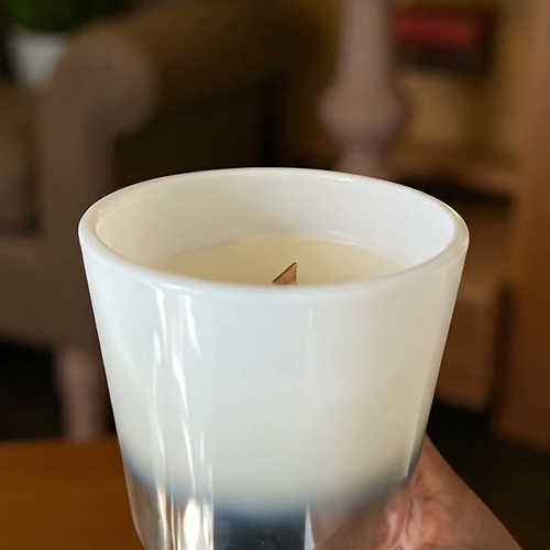 Hush wood wick candle scent Tonka and oud
